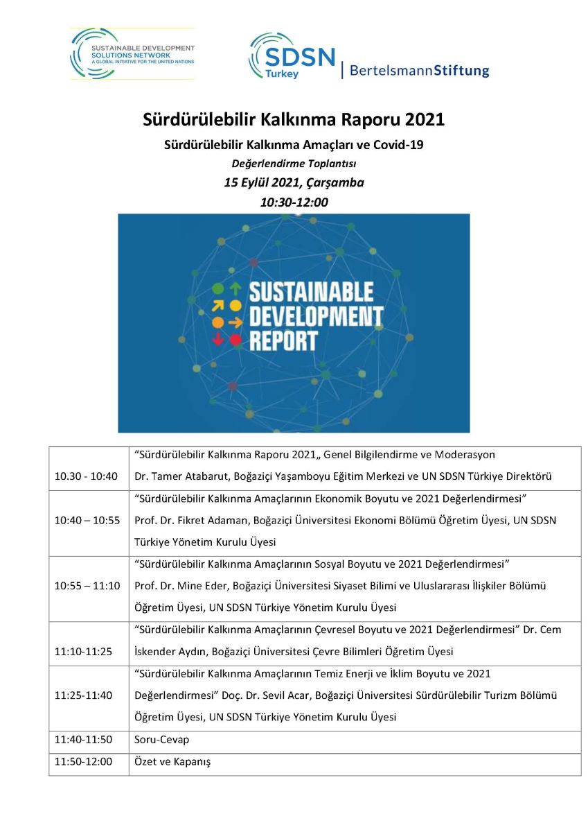 Bertelsmann Stiftung ve Sürdürülebilir Kalkınma Çözümleri Ağı (SDSN) işbirliğinde gerçekleştirilen ve bu yıl altıncısı yayımlanan Sürdürülebilir Kalkınma Raporu 2021, Covid-19’un Sürdürülebilir Kalkınma Amaçları (SKA’lar) üzerindeki etkilerine değinmekte ve ülkelerin SKA’lara yönelik ilerlemesini değerlendirmektedir. 2016’dan bu yana yıllık olarak yayımlanan Sürdürülebilir Kalkınma Raporu’nun 2021 versiyonunu ve Türkiye performansını 15 Eylül Çarşamba günü saat 10:30-12:00 arasında Dr. Tamer Atabarut moderasyonunda Prof. Dr. Fikret Adaman, Prof. Dr. Mine Eder, Dr. Cem İskender Aydın ve Doç. Dr. Sevil Acar ile değerlendireceğimiz “Sürdürülebilir Kalkınma Raporu 2021” webinarına bekliyoruz.